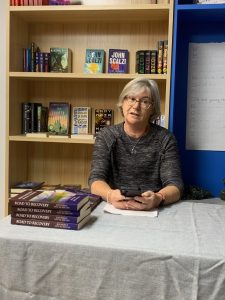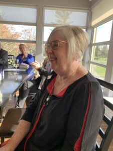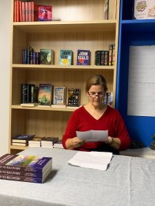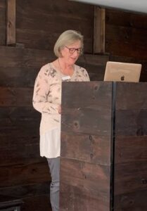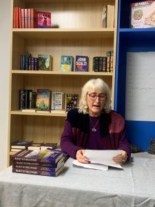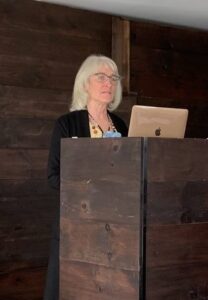 Sue Mills reading from her piece “Cancer, Covid, Retirement”